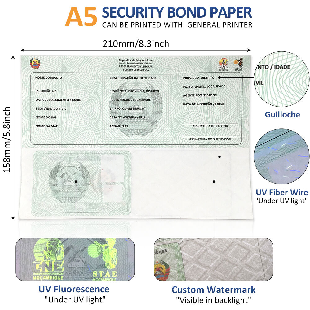 - Security Technologies: Guilloche patern, Invisible Fluorescence, Watermark